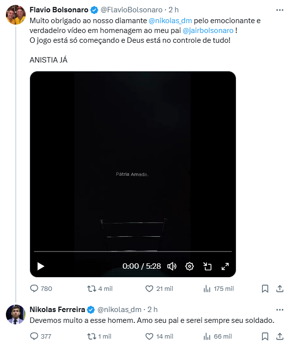 – Muito obrigado ao nosso diamante, Nikolas Ferreira, pelo emocionante e verdadeiro vídeo em homenagem ao meu pai, Jair Bolsonaro! O jogo está só começando e Deus está no controle de tudo!