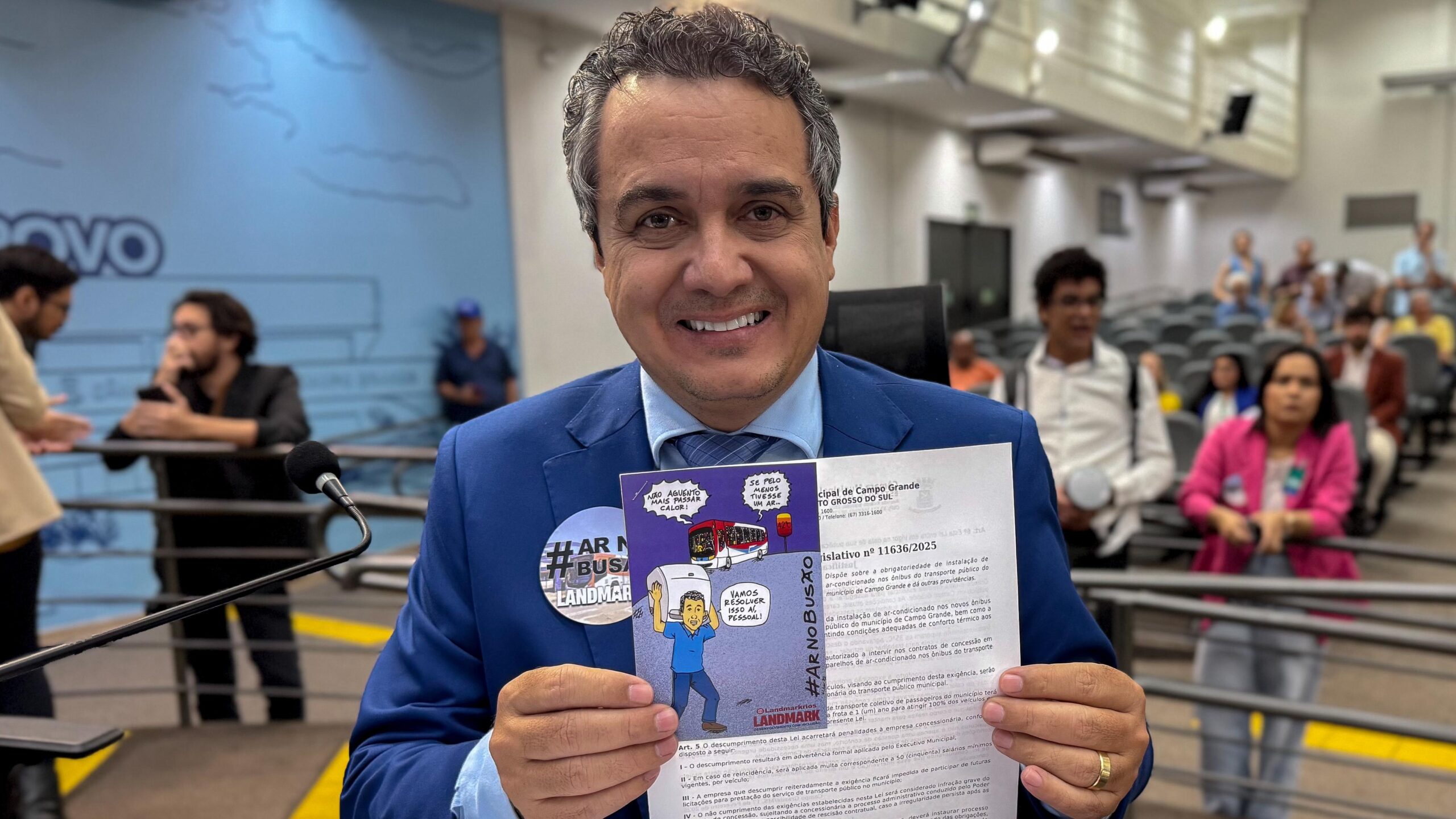 Após a aprovação do Projeto de Lei nº 11.636/2025, que torna obrigatória a instalação de ar-condicionado em todos os novos ônibus do transporte coletivo de Campo Grande, o autor da proposta, vereador Landmark Rios (PT), celebrou o resultado da votação e reforçou a importância da medida para a população campo-grandense.