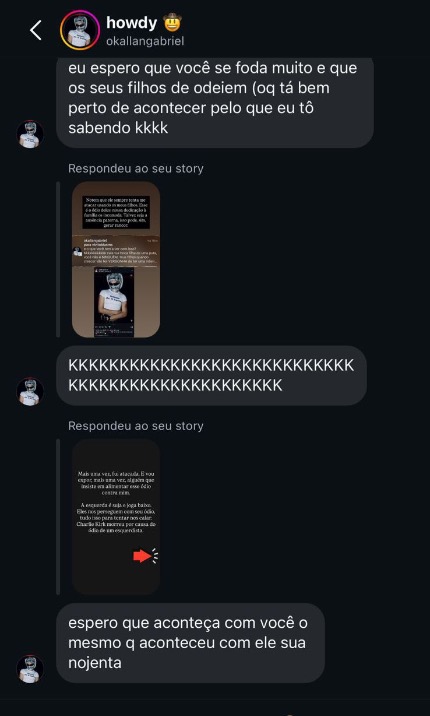 “Espero que aconteça com você o mesmo que aconteceu com ele, sua nojenta”, escreveu o agressor, segundo o registro. Em outros trechos, ele zombou da fé da ativista e atacou os cristãos, afirmando: “Crente é tudo igual” e “Vocês crentes são os abusadores”.