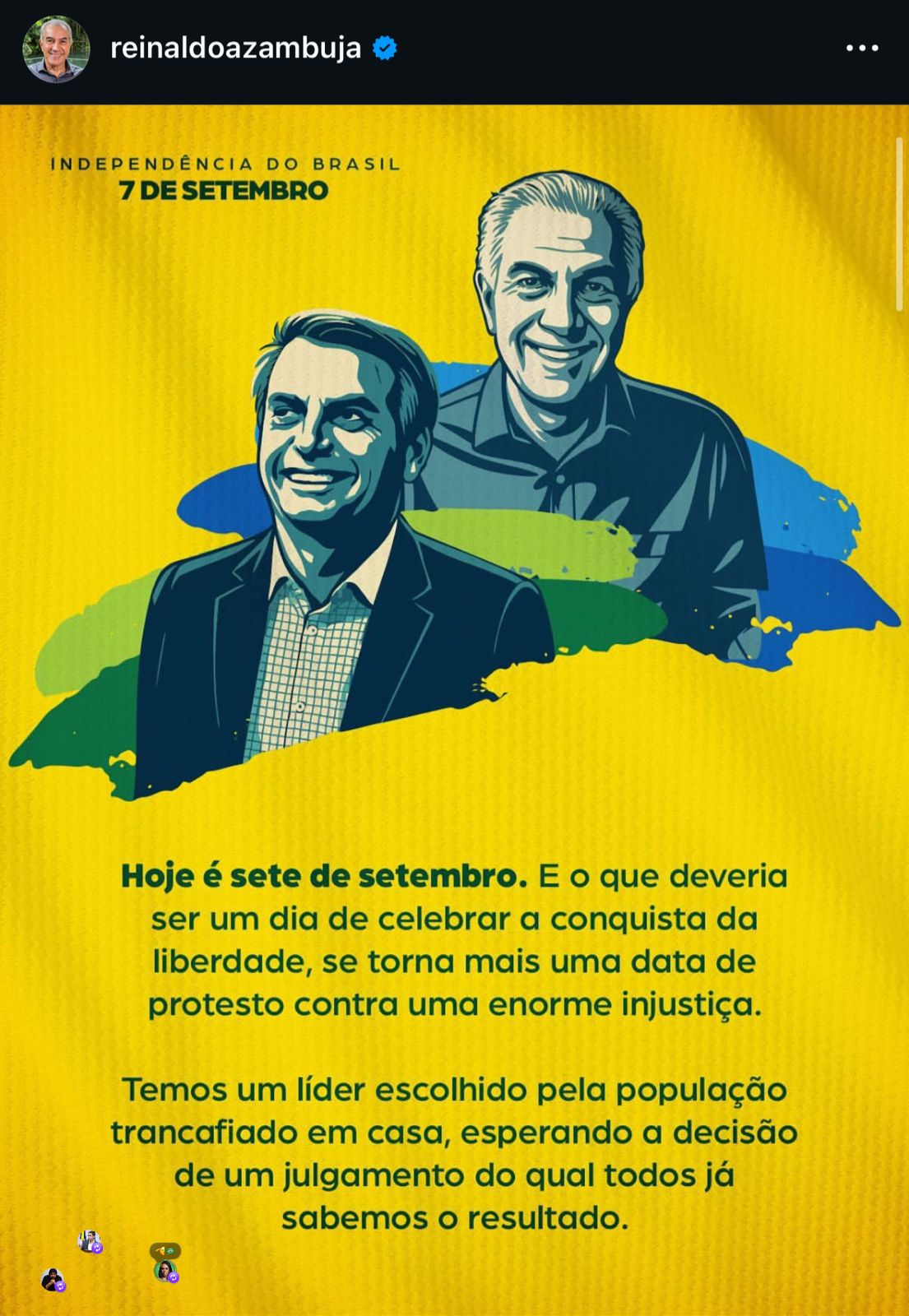 No post, Reinaldo afirmou que o dia que deveria celebrar a liberdade acabou se transformando em data de protesto contra “uma enorme injustiça”, em referência ao processo que mantém Bolsonaro impedido de disputar eleições e sob julgamento no Supremo Tribunal Federal. O ex-governador ainda pediu “anistia e liberdade” para o ex-presidente e para todos os presos que ele classifica como vítimas de “perseguição política”.