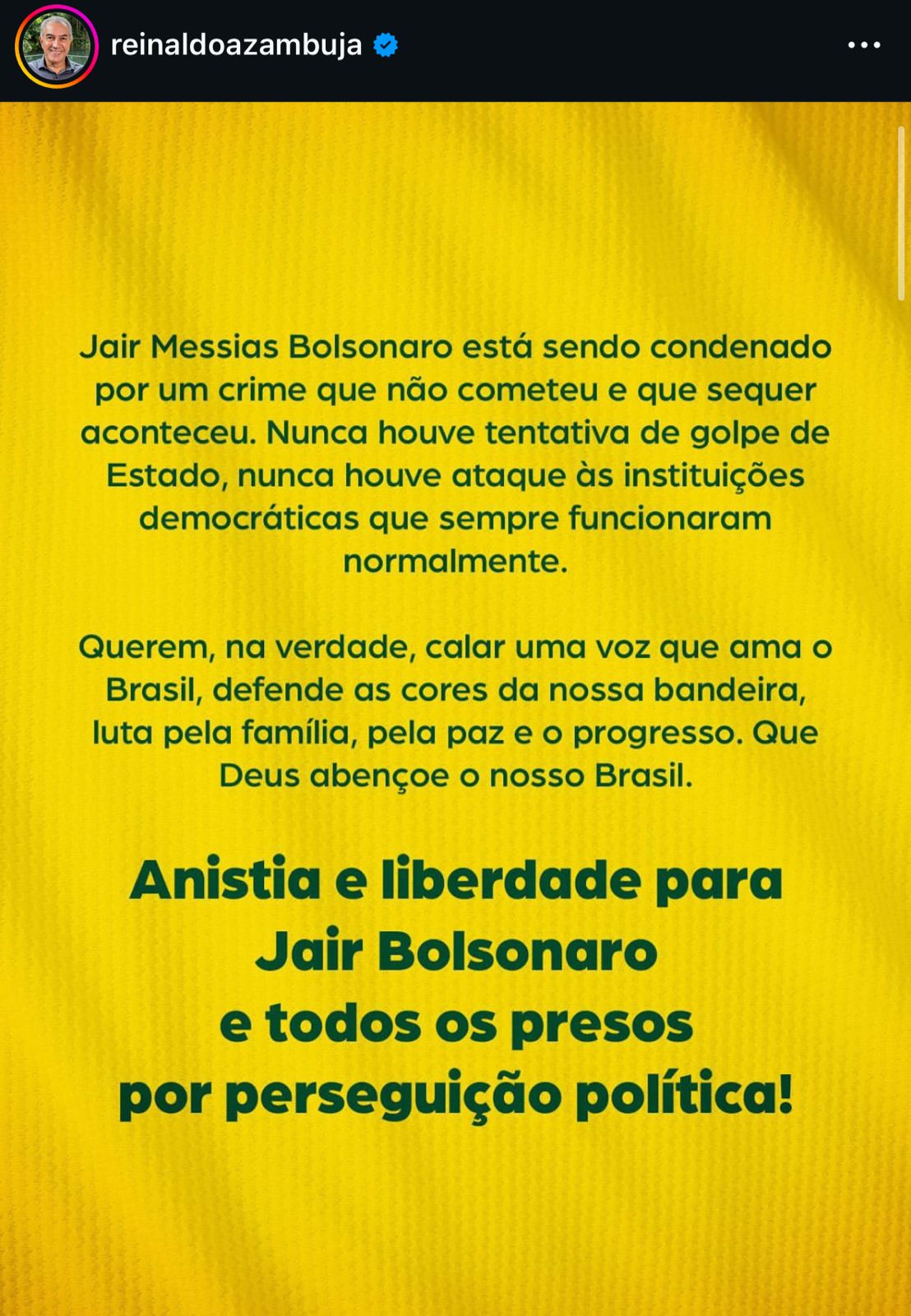 A publicação deste 7 de setembro, portanto, pode sinalizar uma mudança definitiva até mesmo no estilo político de Azambuja. Conhecido por sua postura pragmática, o ex-governador agora ensaia uma aproximação mais explícita com as bases bolsonaristas. Ao defender publicamente a anistia aos condenados pelos atos de 8 de janeiro e colocar-se como voz de apoio a Jair Bolsonaro em Mato Grosso do Sul, Reinaldo envia um recado claro de que pretende exercer liderança política dentro do campo da direita.