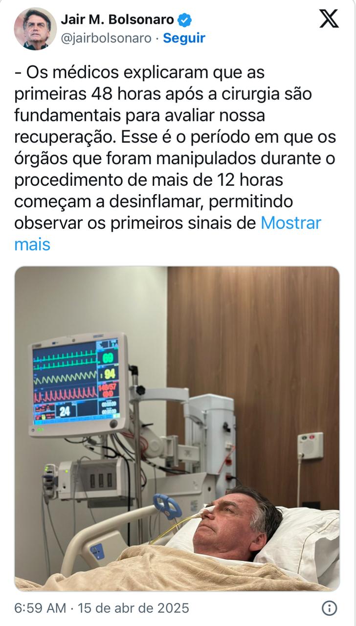O ex-mandatário ressaltou que, por orientação médica, apenas familiares e profissionais de saúde estão autorizados a acompanhá-lo de perto. A estratégia tem como objetivo evitar complicações no pós-operatório.