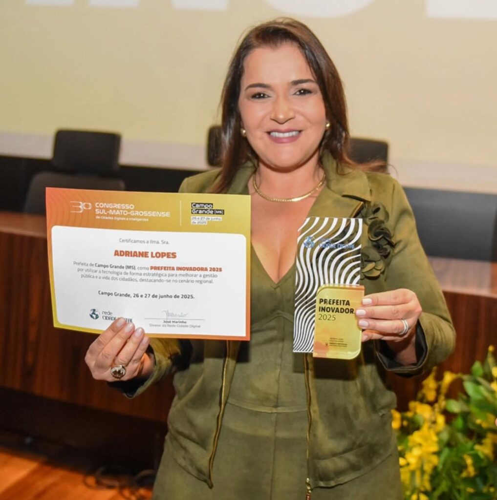 Durante o 3º Congresso Sul-Mato-Grossense de Cidades Digitais e Inteligentes, realizado nos dias 26 e 27 de junho no Bioparque Pantanal, a prefeita de Campo Grande, Adriane Lopes, foi reconhecida como Prefeita Inovadora 2025, destacando a capital como referência em tecnologia na gestão pública.