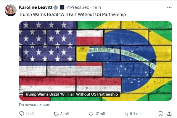 – Trump alerta que Brasil vai falhar sem a parceria com os EUA – escreveu, junto de uma imagem que mostra as bandeiras dos EUA e Brasil entrelaçadas em uma ilustração feita em um muro de tijolos.