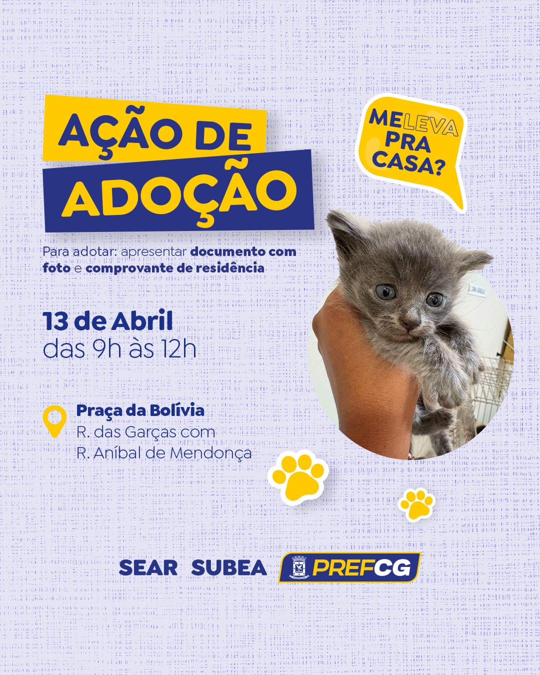 A Superintendência de Bem-Estar Animal (Subea) promove no próximo domingo (13) mais uma edição da sua tradicional feira de adoção de pets. O evento acontece na Praça da Bolívia, das 9h às 12h, e contará com cerca de 60 filhotes, entre cães e gatos, disponíveis para adoção responsável.