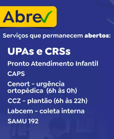 Apenas as UPAs, CRSs, PAI, Samu, Caps, Cenort (urgência ortopédica), CCZ e atendimentos odontológicos de emergência atendem a população nesta terça-feira.