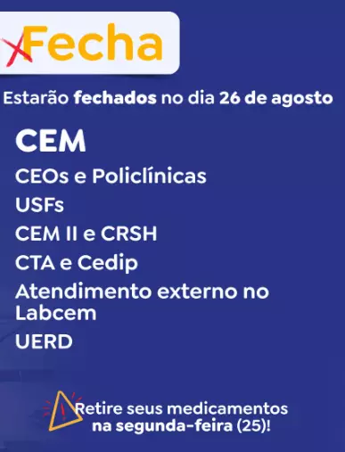 Segundo a pasta, estarão fechados USFs, serviços ambulatoriais, CEM, Cadim e CEO III. Os atendimentos retornam normalmente na quarta-feira (27).