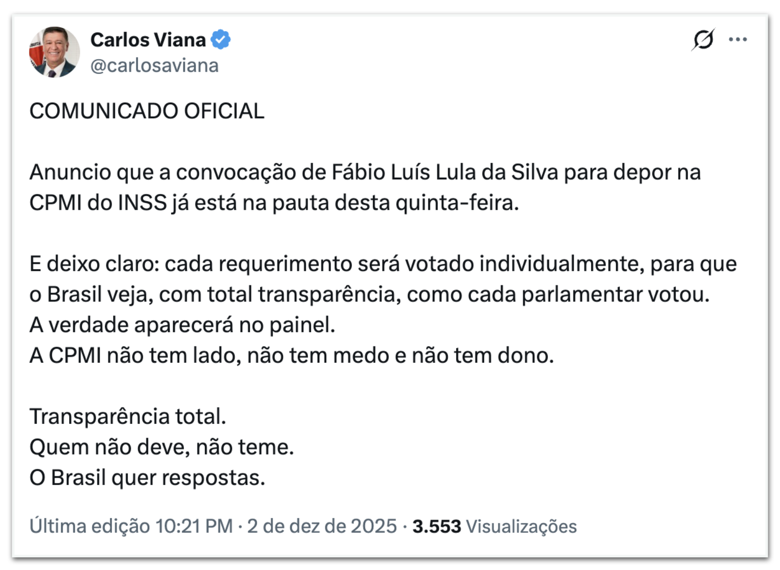 “A CPMI não tem lado, não tem medo e não tem dono. Transparência total. Quem não deve, não teme. O Brasil quer respostas”, escreveu.