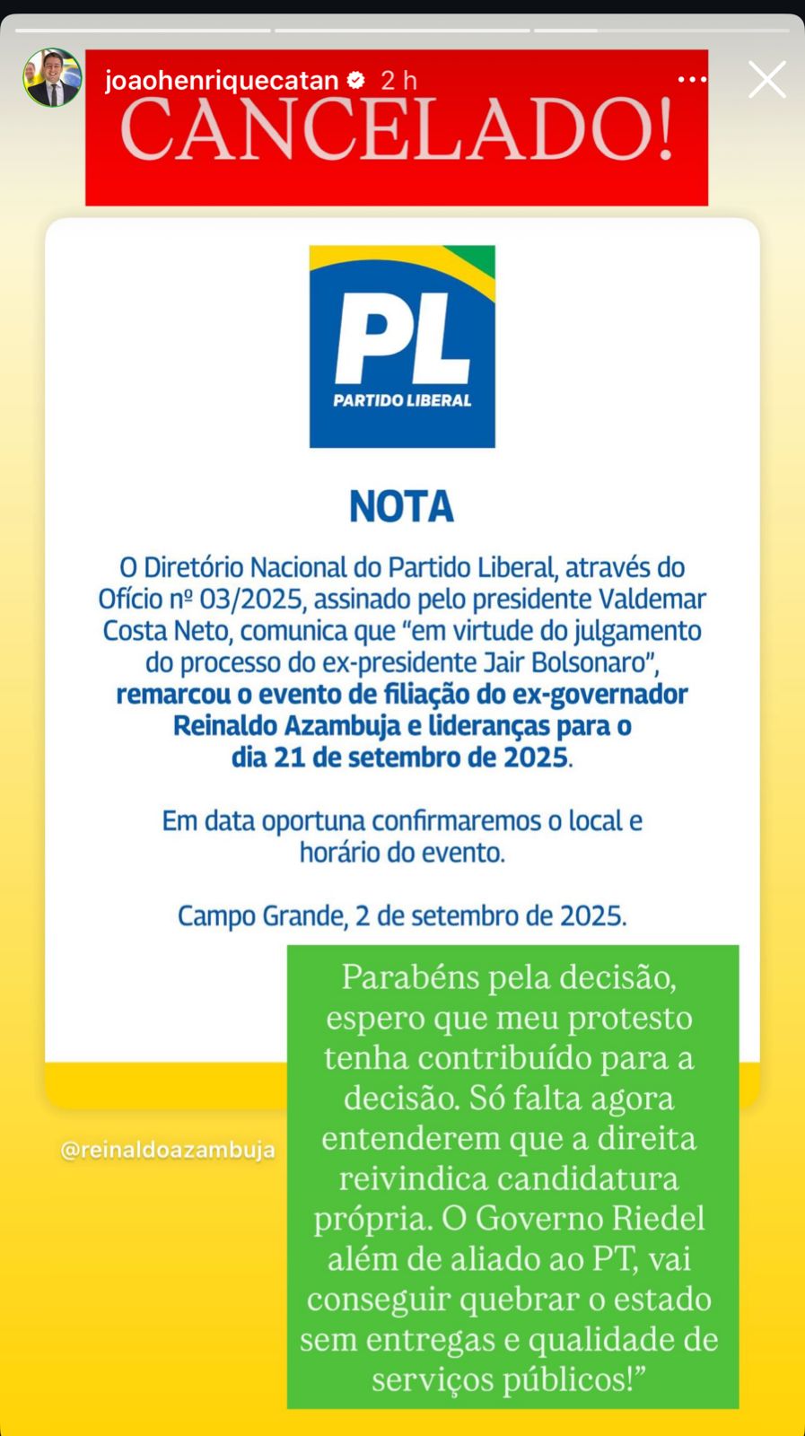 O deputado estadual João Henrique Catan (PL) utilizou as redes sociais, nesta terça-feira (2), para comentar o adiamento do ato de filiação do ex-governador Reinaldo Azambuja ao Partido Liberal (PL). O evento estava inicialmente marcado para o dia 12 de setembro, mas, segundo nota divulgada pelo Diretório Nacional da legenda, foi transferido para o dia 21 de setembro em virtude do julgamento do ex-presidente Jair Bolsonaro, que ocorrerá na mesma data original.
