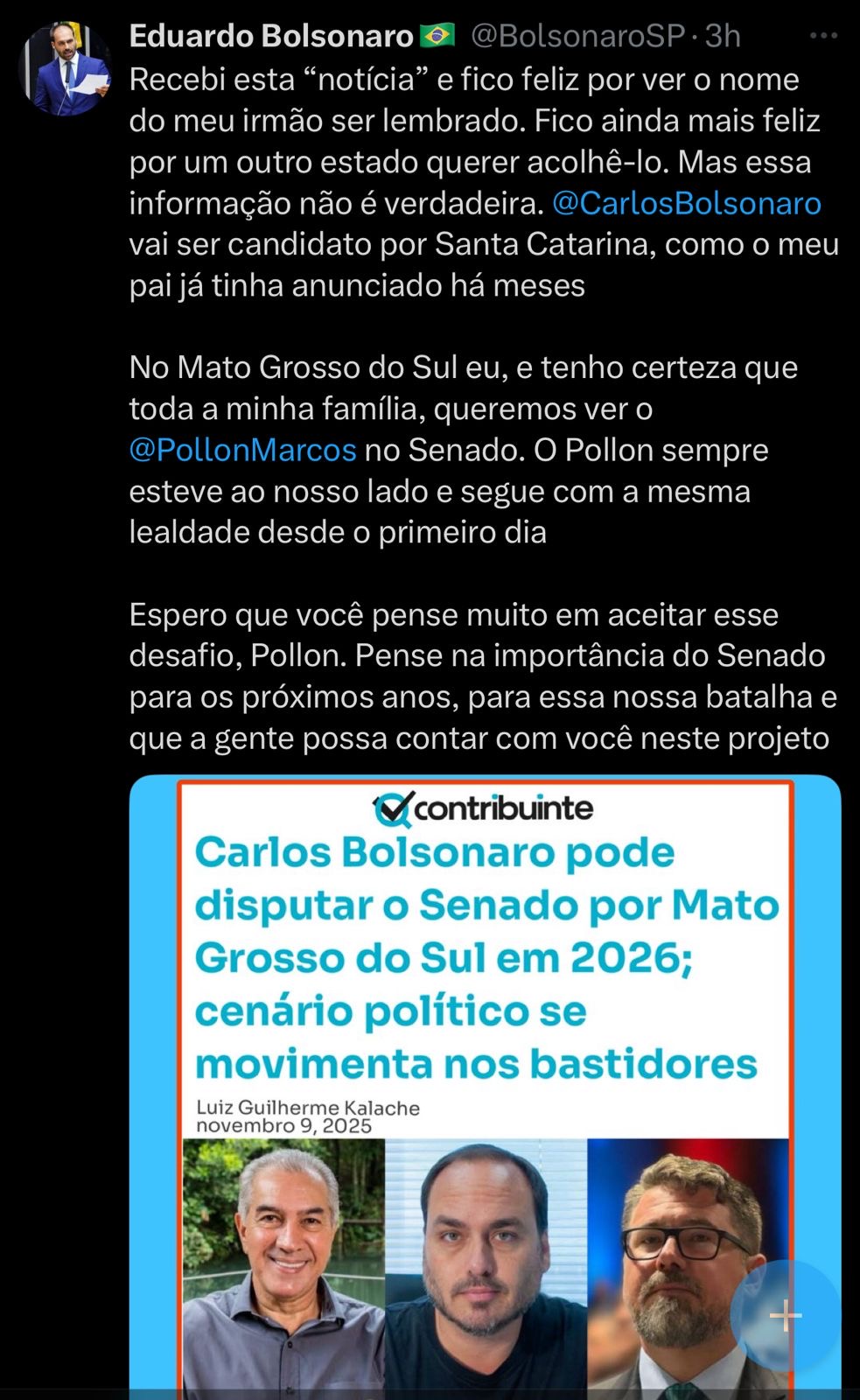 O parlamentar aproveitou a publicação para destacar que o nome da família Bolsonaro para o Senado por Mato Grosso do Sul é o do deputado federal Marcos Pollon (PL).