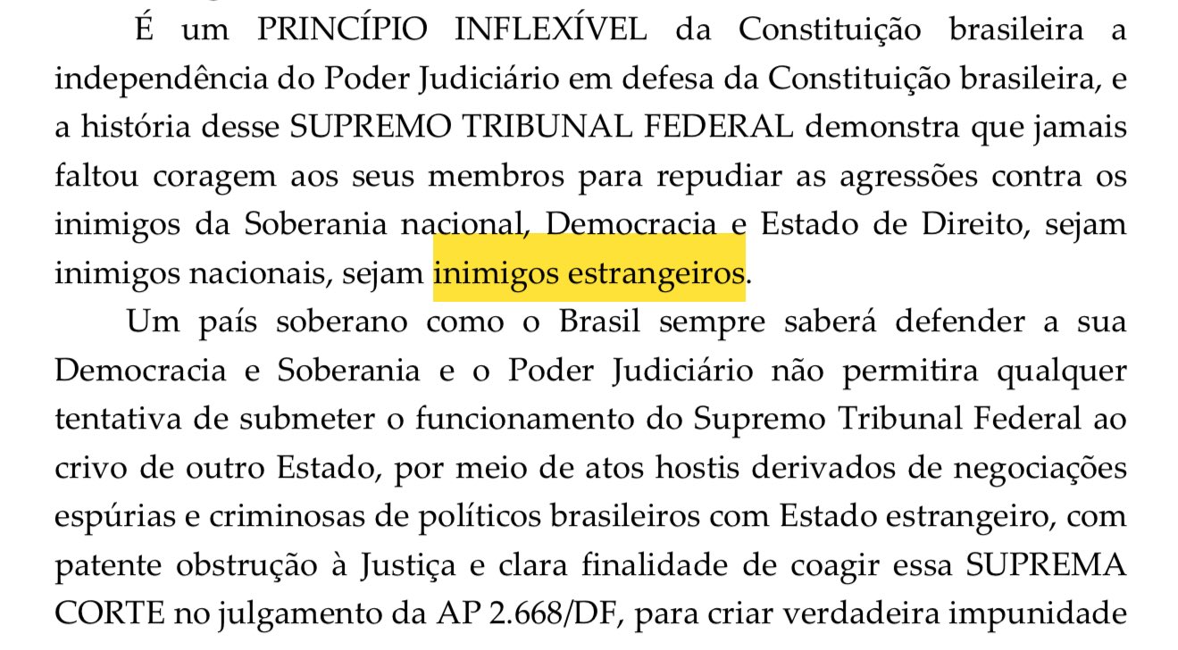 A expressão consta em trecho do despacho onde Moraes afirma que a Corte jamais faltou com coragem para repelir agressões contra a soberania nacional, “sejam inimigos nacionais, sejam inimigos estrangeiros”. A declaração foi publicada pelo jornalista Samuel Pancher, do portal Metrópoles, na rede social X (antigo Twitter).