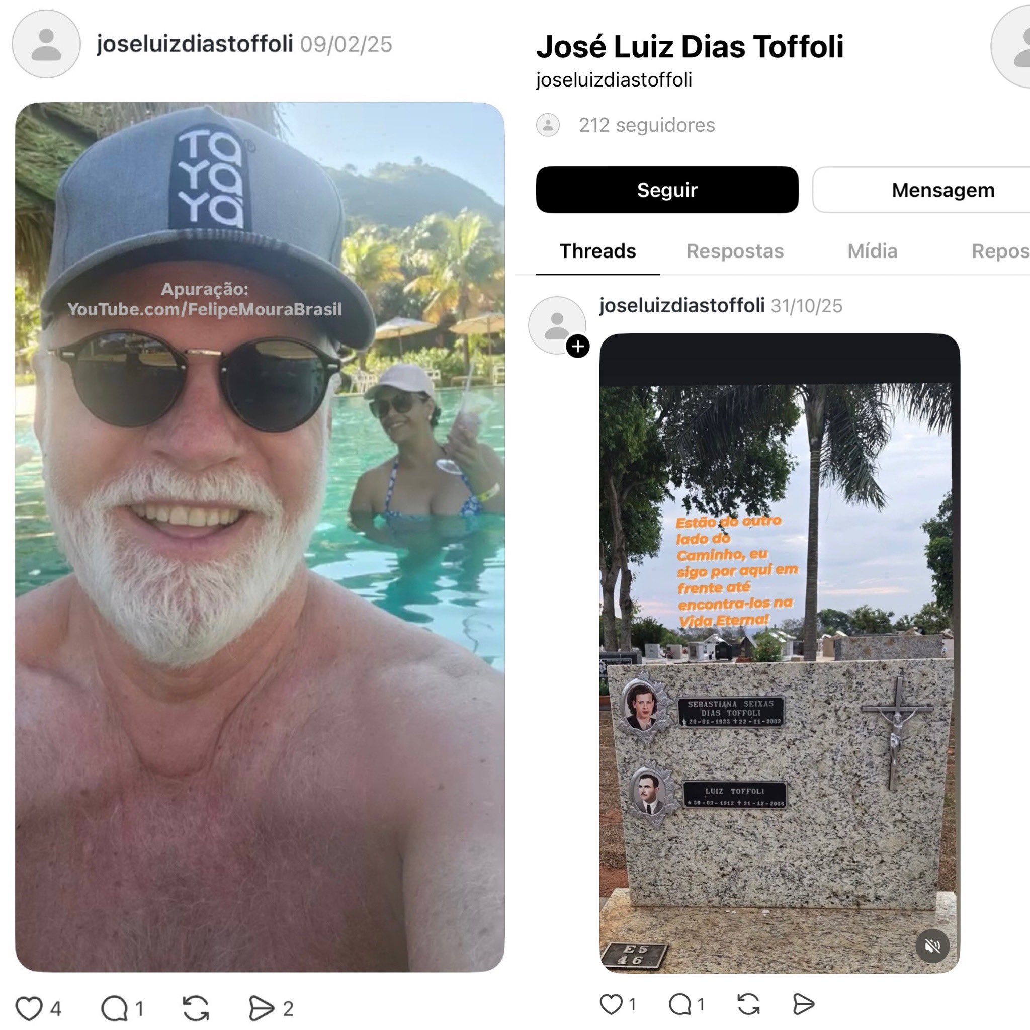 O perfil de José Luiz também reúne registros familiares, incluindo uma foto da lápide de seus pais, Luiz Toffoli e Sebastiana Seixas Dias Toffoli, publicada em 31 de outubro de 2025, sua última atualização.