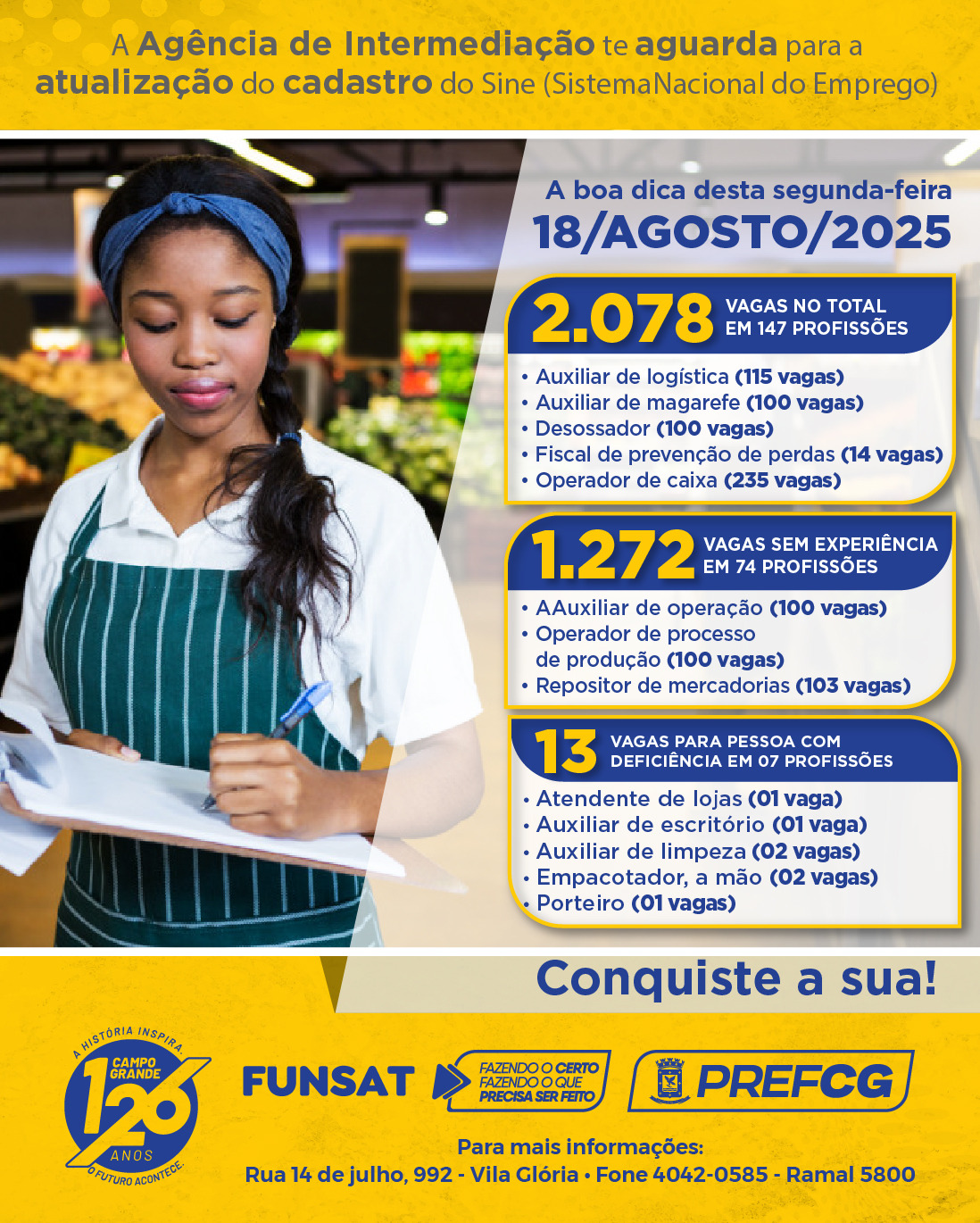 A Fundação Social do Trabalho (Funsat) abriu a semana com um número expressivo de contratações em Campo Grande: 206 empresas estão com vagas ativas no Painel de Vagas, um recorde no mês de agosto. As oportunidades abrangem diversas áreas e perfis profissionais — de quem busca o primeiro emprego a funções específicas para Pessoas com Deficiência (PCDs).