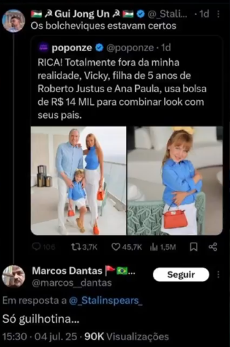 O professor Marcos Dantas, da Universidade Federal do Rio de Janeiro (UFRJ), sugeriu o uso de “guilhotina” contra Vicky Justus, de 5 anos, filha do empresário Roberto Justus, em comentário feito nas redes sociais neste fim de semana.