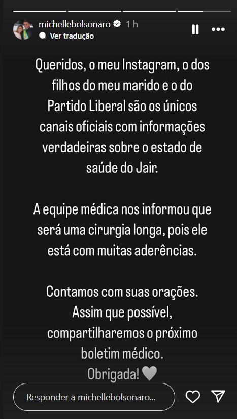 A ex-primeira-dama Michelle Bolsonaro se pronunciou na tarde deste domingo (13) sobre a cirurgia do ex-presidente Jair Bolsonaro (PL), que começou às 8h30 e segue acontecendo durante esta tarde. Em uma postagem nos stories, Michelle disse que foram detectadas muitas aderências intestinais em Bolsonaro e que, por isso, a cirurgia deve ser longa.