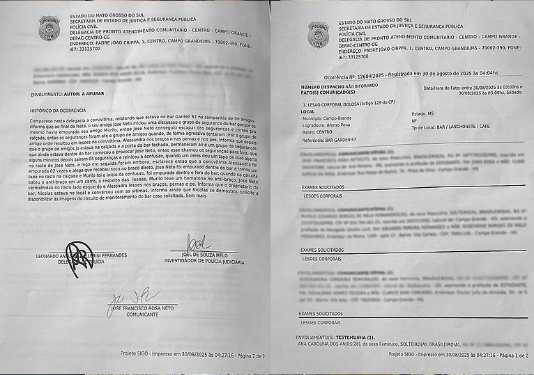 José Neto, amigo de Murilo, tentou intervir e acabou recebendo um soco no olho direito, que causou um corte e forte sangramento. Alessandra, também do grupo, tentou acalmar a situação e foi atingida no braço, além de ser derrubada no chão. Com dores intensas, ela precisou procurar uma Unidade Básica de Saúde (UBS) para atendimento.