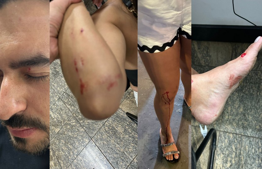 Entre as vítimas estão Murilo, Alessandra e José Neto, que registraram boletim de ocorrência e passaram por exames de corpo de delito após sofrerem lesões visíveis. As imagens (fotos acima) mostram hematomas, cortes e sangramentos provocados pelas agressões.