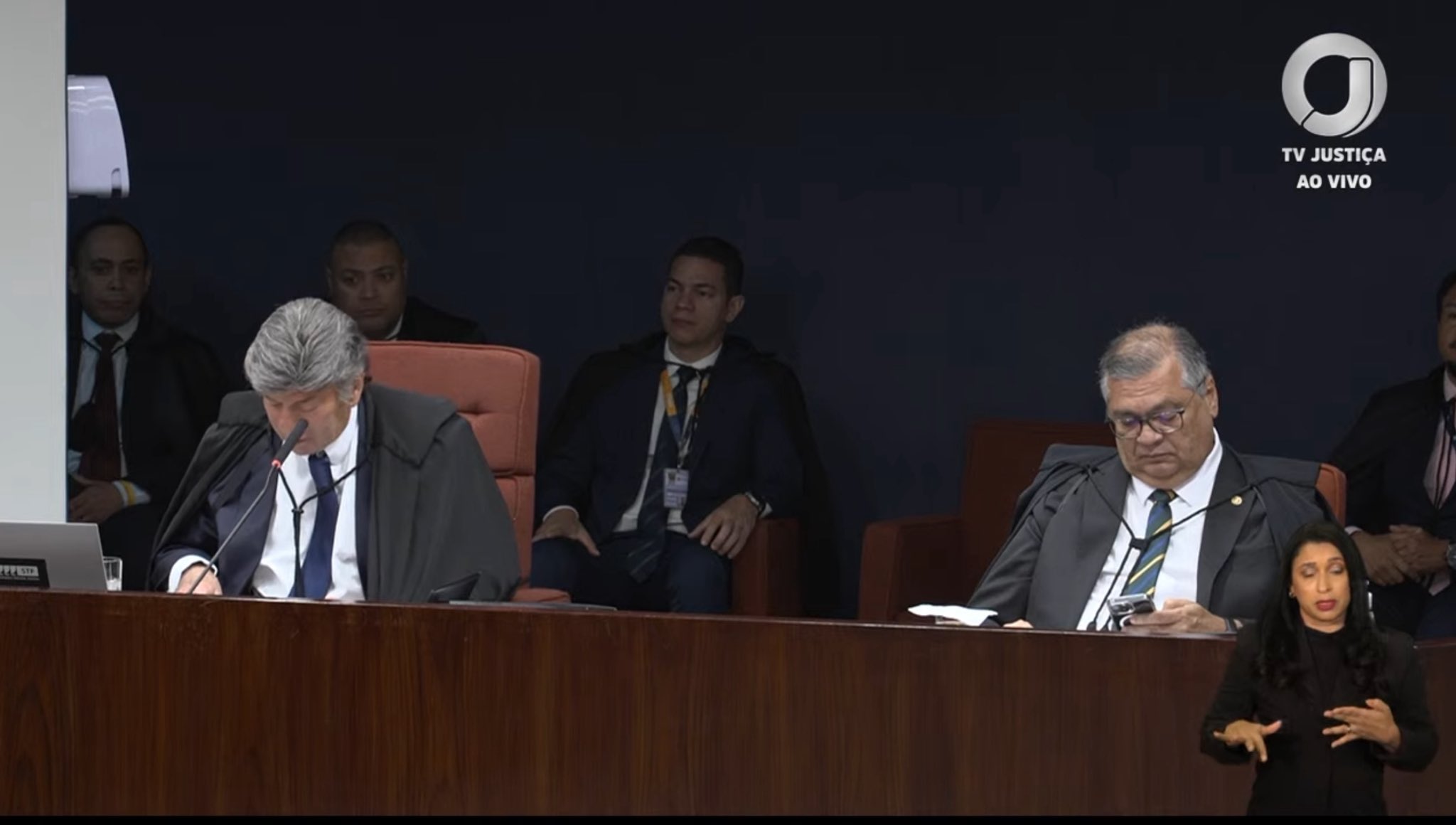 Durante a sessão plenária do Supremo Tribunal Federal (STF) desta quarta-feira (10), transmitida ao vivo pela TV Justiça, o ministro Flávio Dino foi flagrado manuseando o celular enquanto o colega Luiz Fux lia o seu voto.
