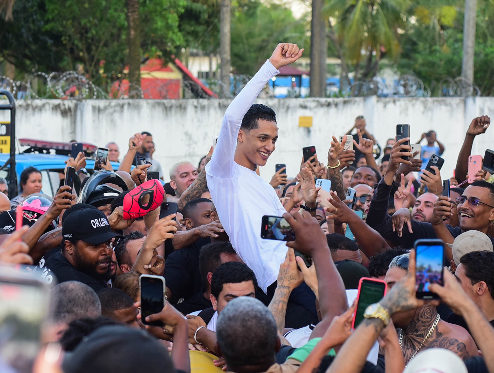 Após ser solto, o artista apareceu e foi recebido por seus fãs na saída do presídio e posou fazendo expressões de deboches.