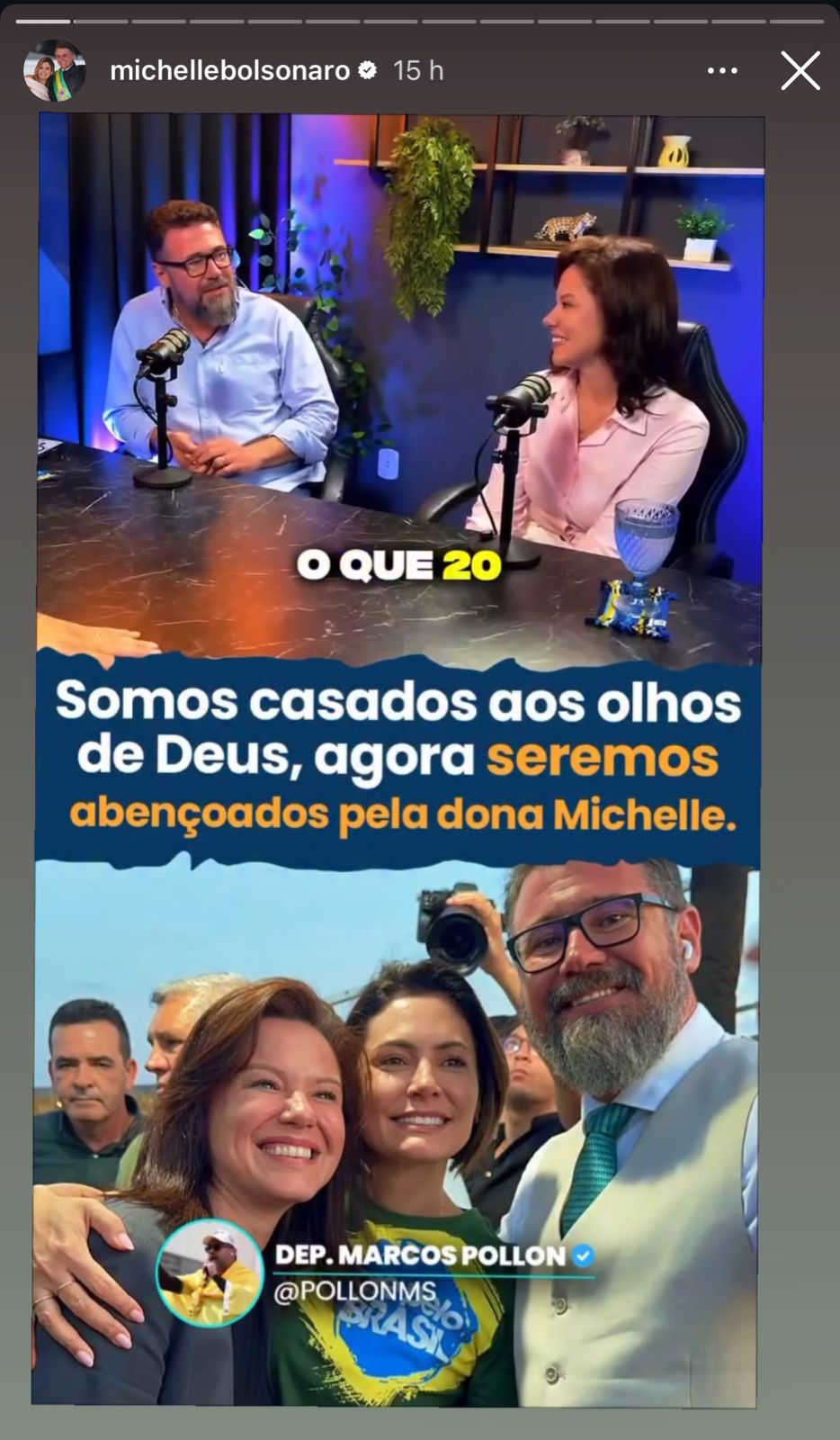 Antes da declaração política nas redes sociais, Marcos Pollon participou, ao lado de sua esposa, Naiane Bittencourt, de um podcast nesta quinta-feira. Durante a entrevista, o deputado fez um anúncio pessoal que rapidamente repercutiu na ala conservadora: Michelle Bolsonaro será madrinha do casamento civil do casal, previsto para ocorrer em 2026.
