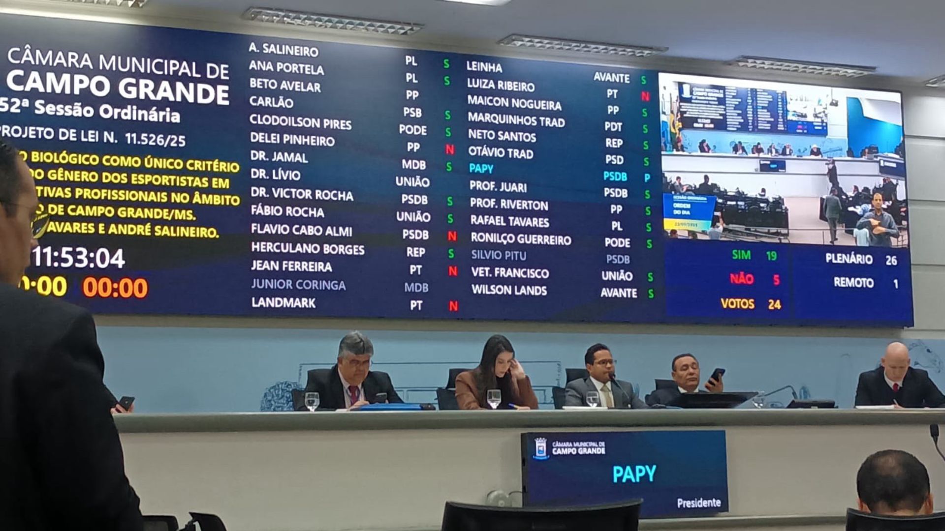 A Câmara Municipal de Campo Grande aprovou nesta terça-feira (23), em primeira discussão, o Projeto de Lei nº 11.526/25, de autoria dos vereadores Rafael Tavares (PL) e André Salineiro (PL), que estabelece o sexo biológico como único critério para a definição do gênero de atletas em competições profissionais realizadas no município.