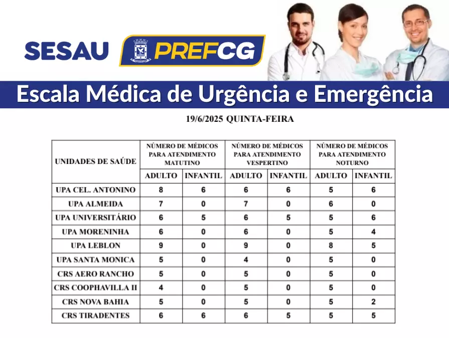 Precisa de atendimento médico? A Sesau (Secretaria Municipal de Saúde) divulgou a escala médica das unidades de saúde de Campo Grande para este ferido de Corpus Christi (19). Mais de 100 médicos estarão trabalhando nas UPAs (Unidades de Pronto Atendimento) e nos CRSs (Centros Regionais de Saúde)