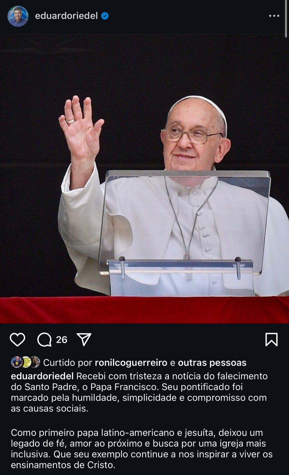 “Como primeiro papa latino-americano e jesuíta, deixou um legado de fé, amor ao próximo e busca por uma igreja mais inclusiva. Que seu exemplo continue a nos inspirar a viver os ensinamentos de Cristo”, finalizou o governador.