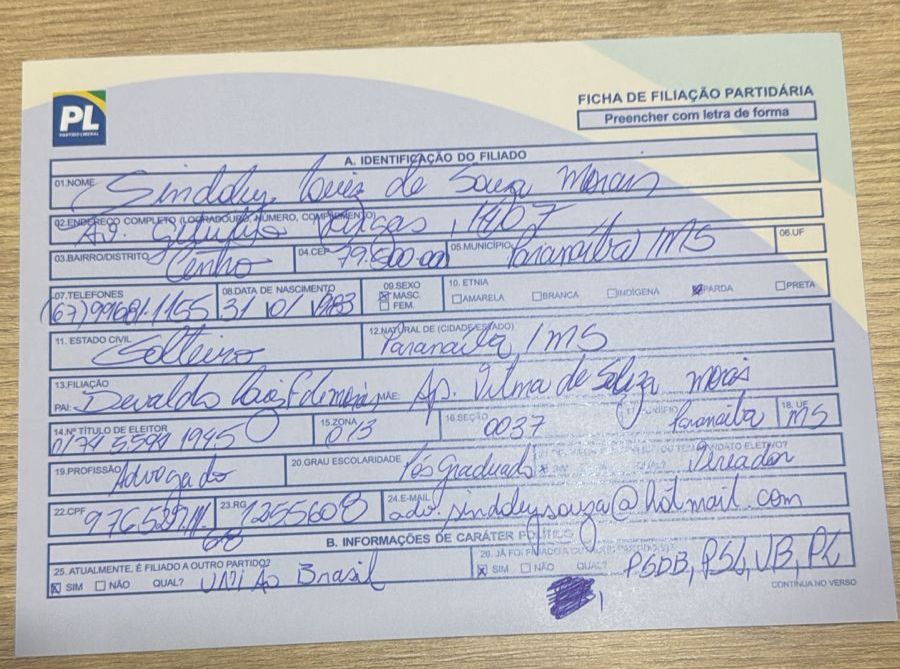O vereador Sindoley Morais formalizou, na tarde desta segunda-feira (30), sua filiação ao Partido Liberal (PL). Até então, ele integrava os quadros do União Brasil, legenda ligada à ex-deputada federal Rose Modesto e que atualmente compõe a federação União Progressista, liderada pela senadora Tereza Cristina.
